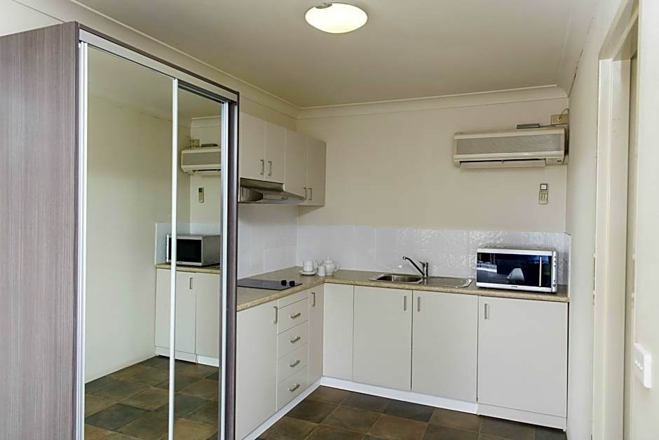 Each Studio Room includes a kitchenette equipped with a microwave, fridge, toaster, kettle, and cooktop ideal for extended stays. Additional amenities include a TV, ensuite, iron and ironing board, hairdryer, table and chairs, desk, wardrobe, split-system air conditioning, and free WiFi.